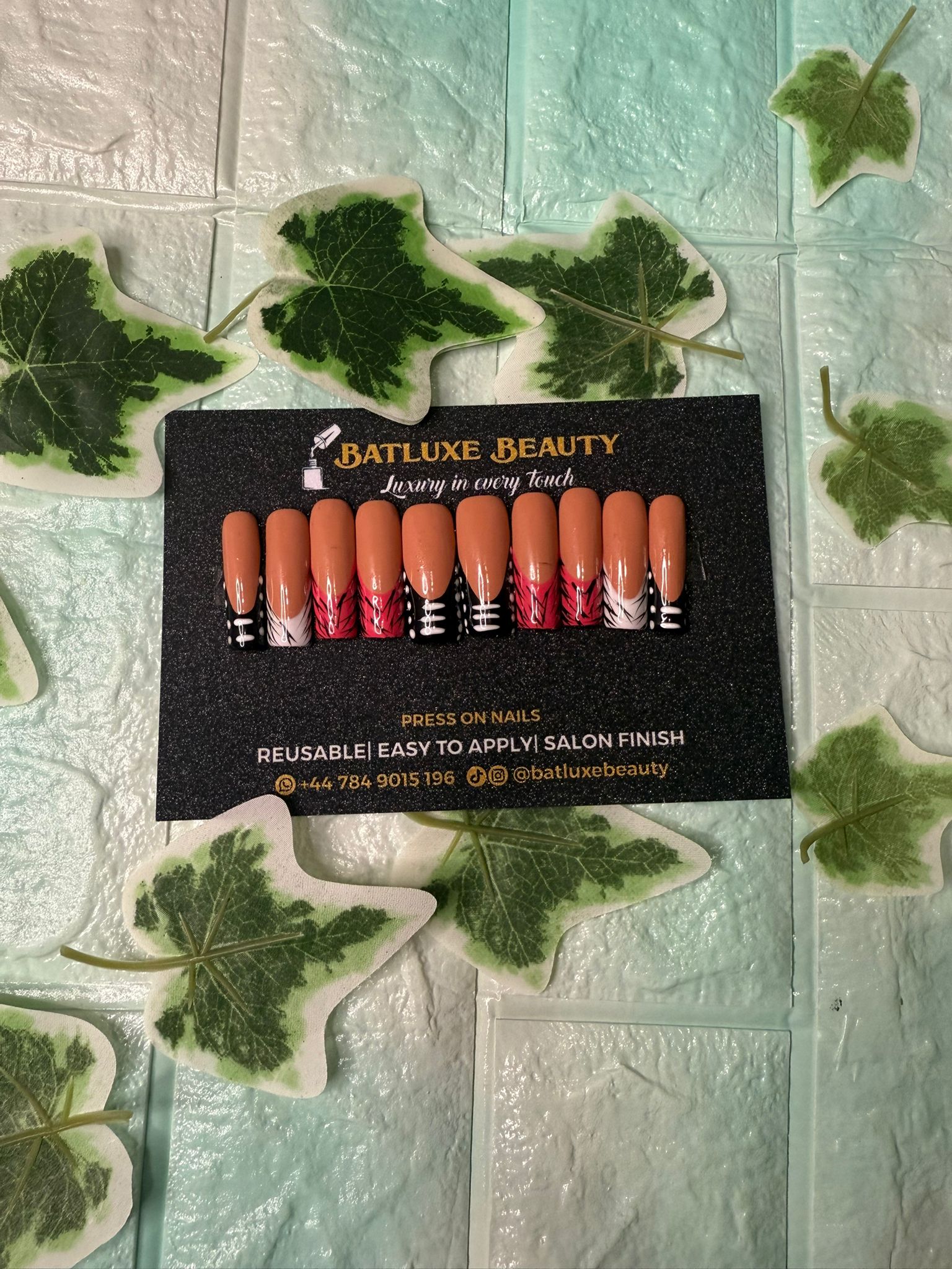 This artistic press-on nail set features bold abstract flame-inspired designs in red, black, and white over a nude base. It’s edgy, creative, and made for trendsetters.