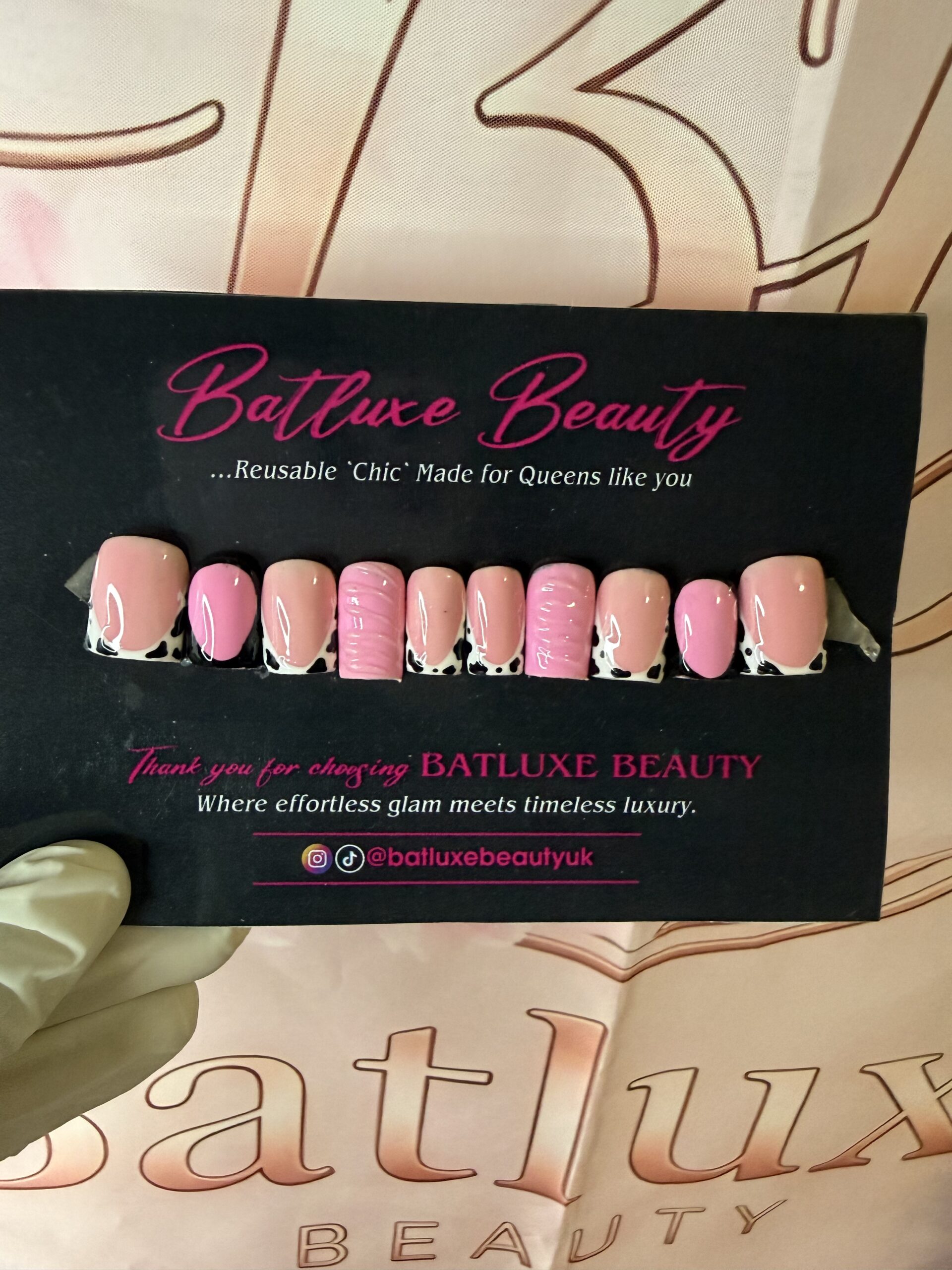 The Batluxe Pink Moo Chic Press-On Nails blend glossy baby pink and nude tones with trendy cow-print French tips for the ultimate soft-girl aesthetic. Perfect for everyday wear while still standing out.