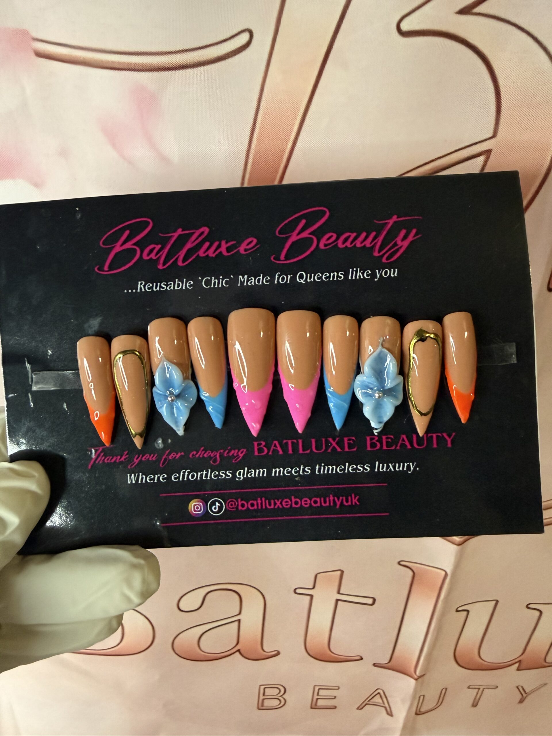 The Batluxe Sunset Bloom Press-On Nails combine a soft nude base with vibrant neon tips and 3D floral art for the ultimate statement glam. Designed for queens who love colour but still want luxury elegance.